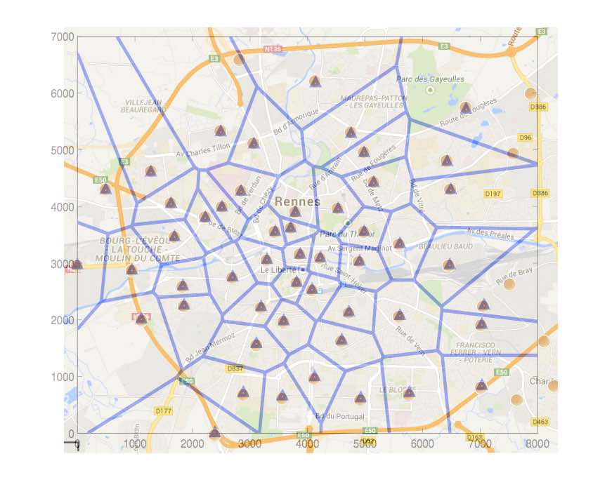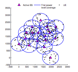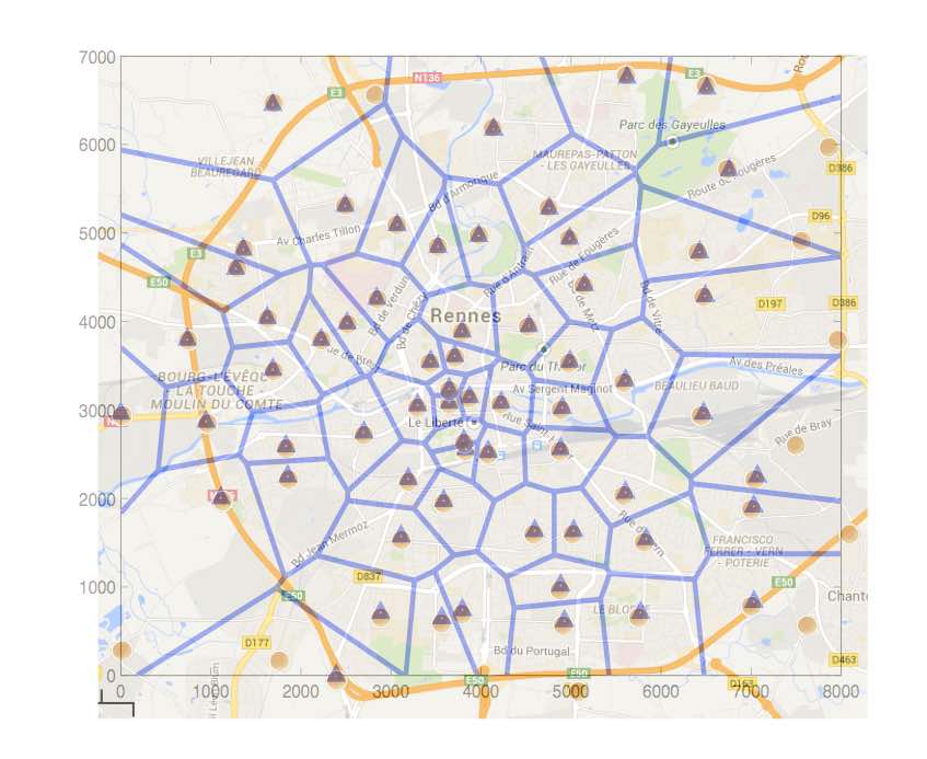 We used the antenna positions generated by the automation tool in our work entitled Joint Power-Delay Minimization in 4G Wireless Networks (by Farah Moety, Samer Lahoud, Bernard Cousin, and Kinda Khawam), published in the proceedings of the Wireless Days conference (WD'14) in 2014. In this scientific work, we propose an algorithm that computes the transmit power level of the network Base Stations (BSs) and associate users with these BSs. The objective is to jointly minimise the total network power and the total network delay. In the following figure, we show the coverage area of each BS when transmitting at the lowest power level and the user distribution in the studied area.