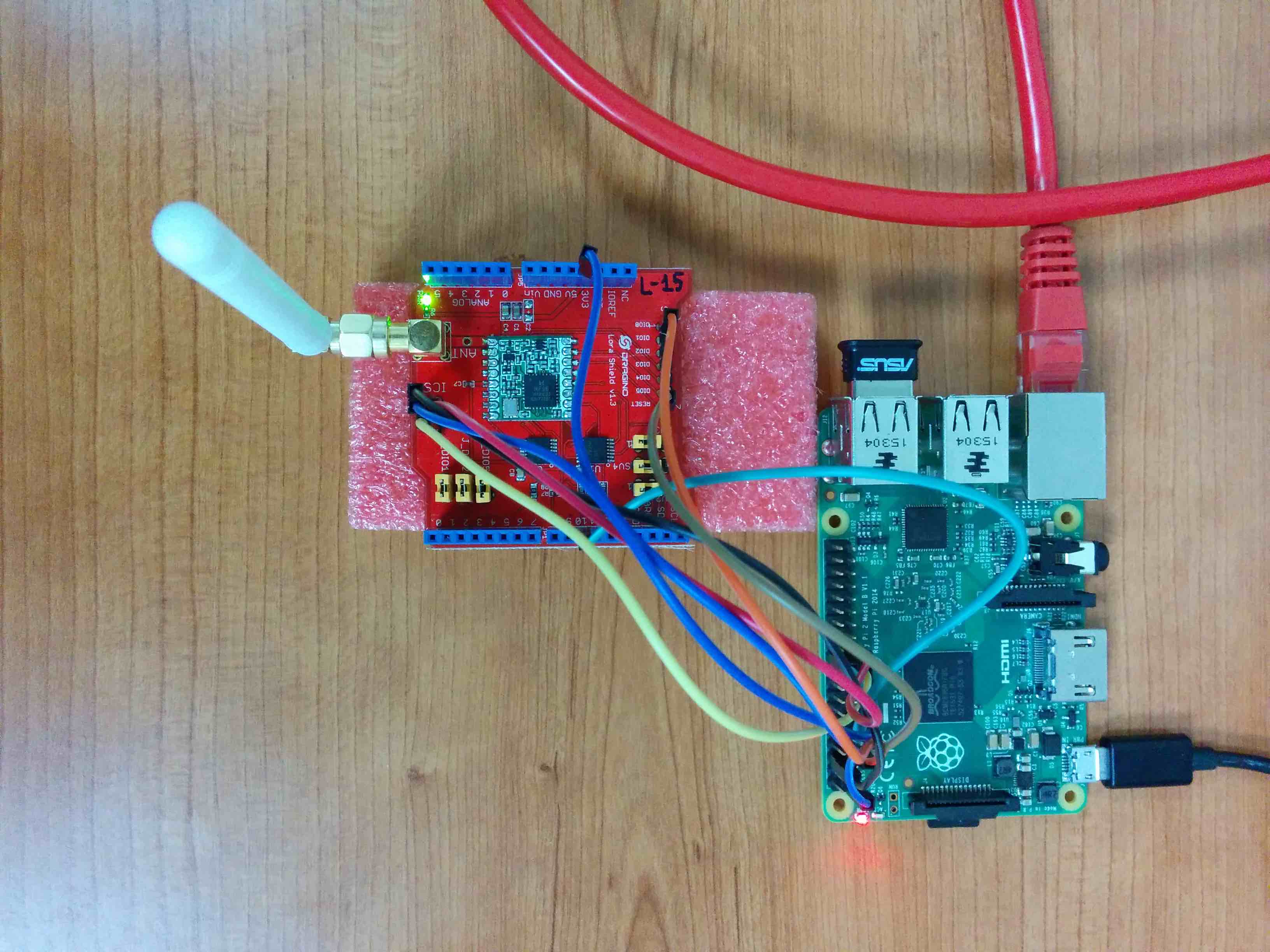 The single channel gateway includes a LoRa transmission module (Dragino Shield) connected to a Raspberry Pi (2 or 3) as shown in Figure 2. Communication between the two modules is done over an SPI interface.