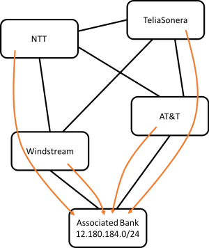 La banque Associated Bank dispose de huit préfixes d'adresses IP dont le préfixe 12.180.184.0/24 qui est l'objet de cette étude. Ce préfixe est annoncé par BGP aux fournisseurs d'accès de la banque : AT&T et Windstream. A leur tour, AT&T et Windstream relayent l'annonce de préfixe de la banque vers NTT et TeliaSonera. Ainsi, de proche en proche, l'information de routage se propage pour atteindre tous les réseaux sur Internet comme indiqué sur la figure 1.