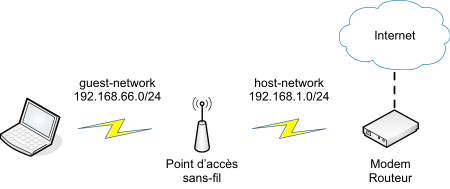 On dispose d'un modem routeur connecté à Internet. Ce modem annonce un SSID host-network. Le réseau IP correspondant est 192.168.1.0/24. Dans la suite, on présente les configurations nécessaires pour permettre à un point d'accès sans-fil d'étendre la connectivité du réseau local. En particulier, le point d'accès se connecte en mode station au modem routeur. De plus, il annonce un SSID guest-network et une plage d'adresses IP 192.168.66.0/24. Ainsi, les machines peuvent s'associer au SSID annoncé par le point d'accès et accéder à Internet.