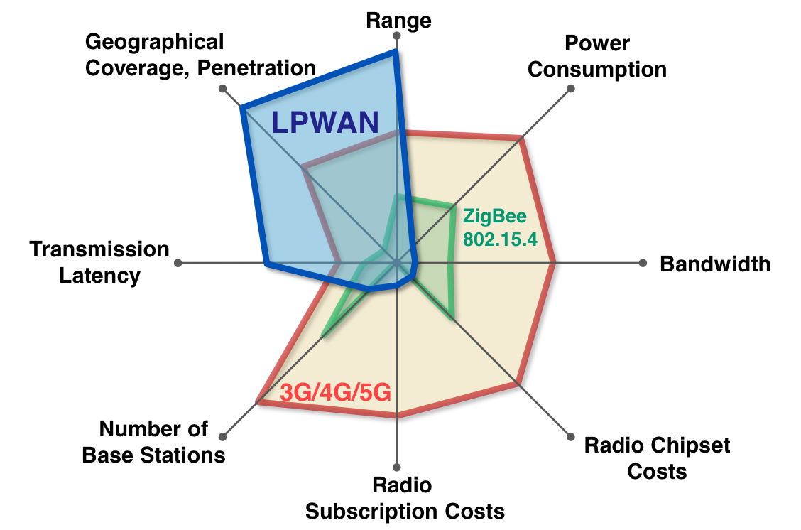 In the battle field, Low-Power WAN (LPWAN) technologies have made significant moves to become the default specialist network for IoT. These technologies fill the gap by providing long range (up to 40km) and low power connectivity (sensors operated on a battery) as seen in Fig. 2. Further, they allow low cost radio devices and operation thus enabling scaling up IoT applications.
