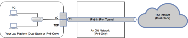 As shown in Figure 1, we suppose that your lab is equipped with either dual-stack (supporting IPv4 and IPv6) devices or IPv6-only devices. In order to get IPv6 connectivity to your lab, you need to traverse a legacy IPv4-only network. Unfortunately, this is still the case for many Internet Service Providers around the world.