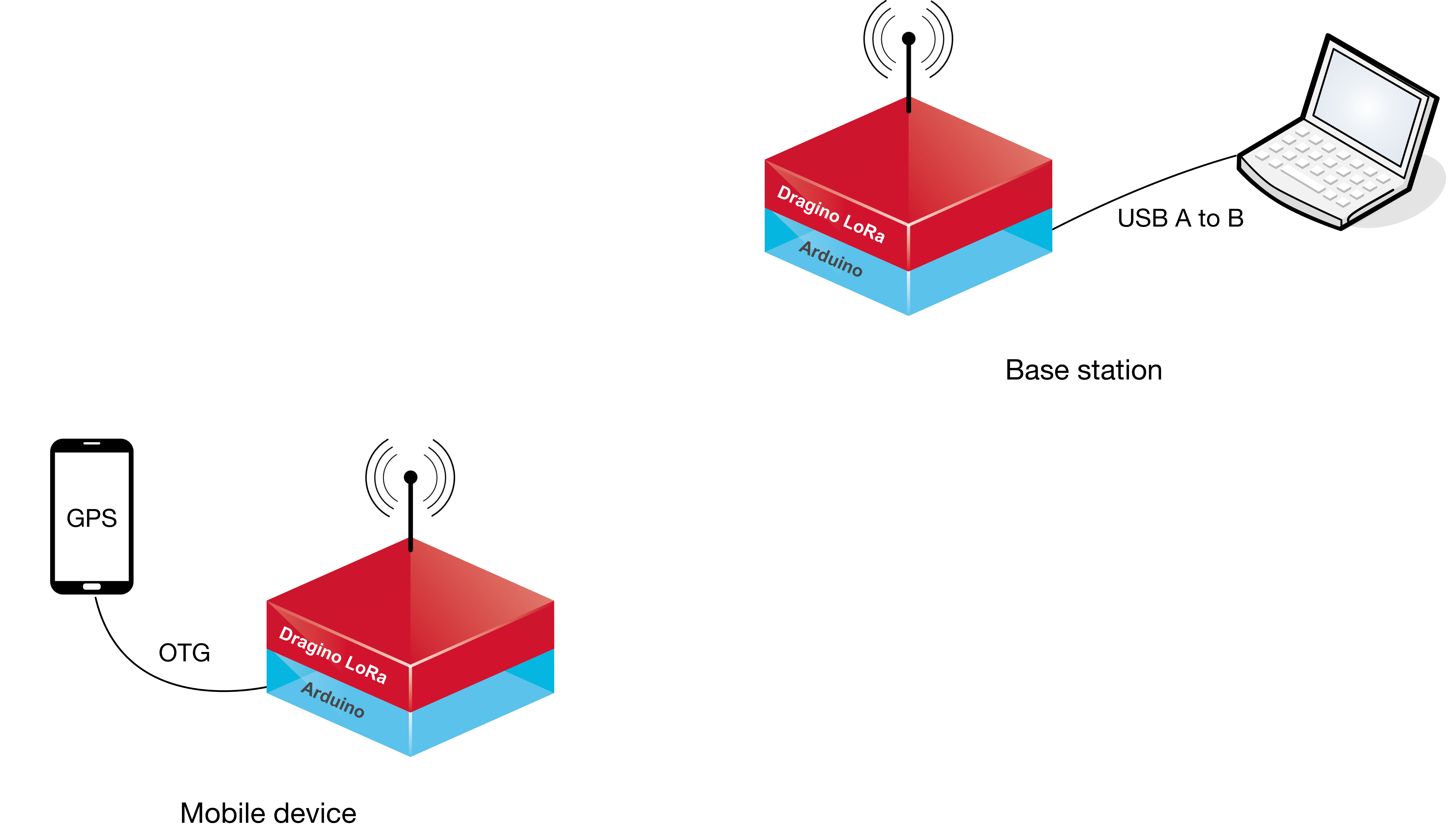 As shown in Fig. 1, the LoRa Dragino shields are plugged into the Arduino devices. The first combined module is connected to a computer with a USB A to B cable and will serve as a fixed base station as in Fig. 2. The second combined module is connected to a smartphone using an OTG cable and will serve as the mobile coverage tester.