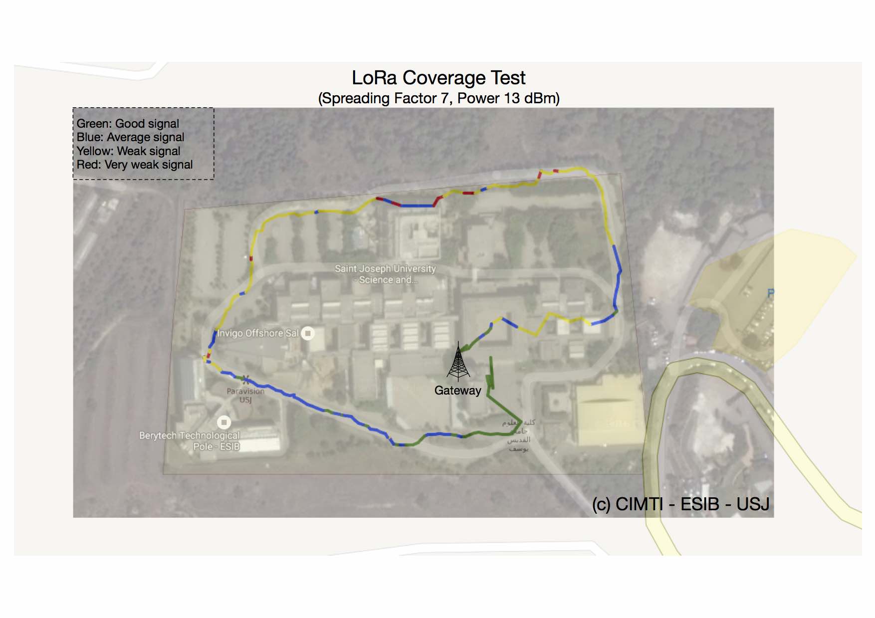 Starting from September 2016, Saint-Joseph University of Beirut (USJ) will be deploying the first academic LoRa network in Lebanon. The network will support monitoring of micro-climate conditions in vineyards. Here below you can find the first radio coverage tests that enable to assess the basic performance of the LoRa technology.
