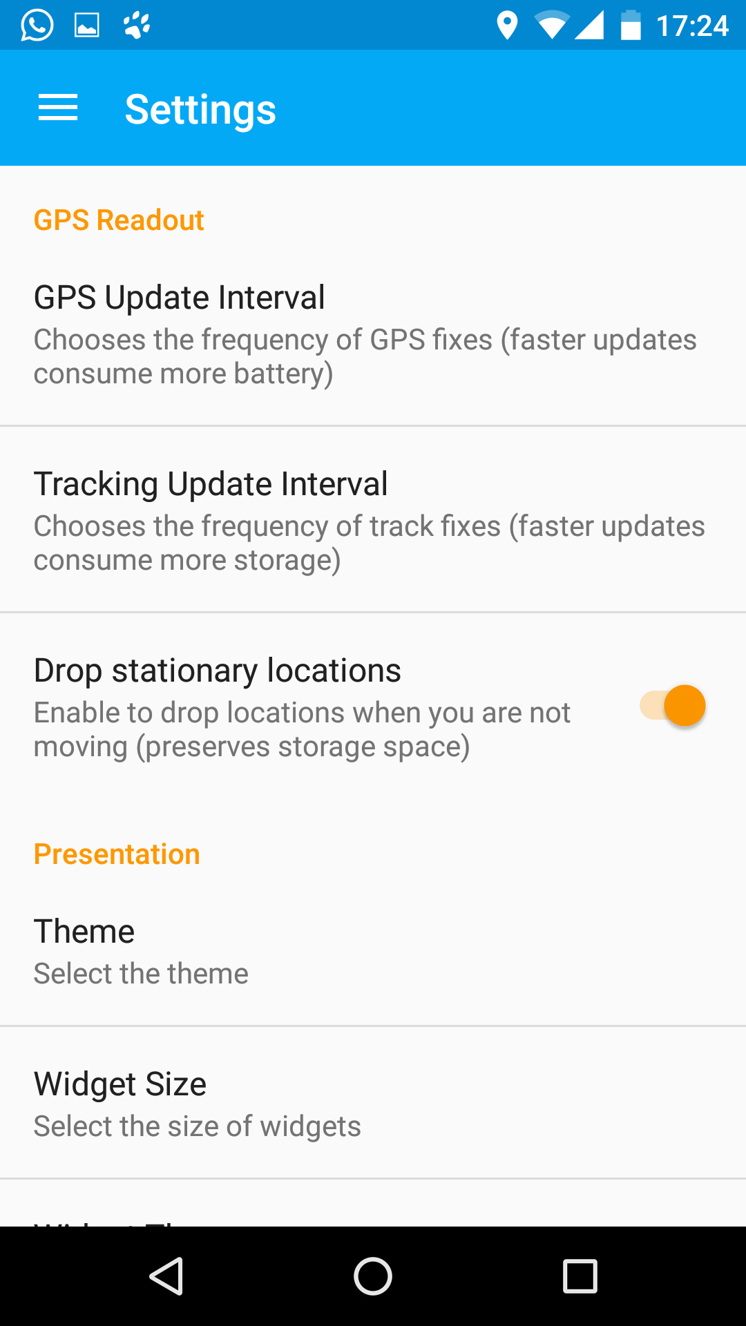 On the mobile device side, you should install and run GPS Essentials. This software is available for any android mobile platform and enables to track the mobile device by saving GPS coordinates in an XML file. Once installed, go to settings and fix the update interval to 10 seconds: this interval should be equal to the transmit interval of the LoRa devices. Now, you can launch a track as in the following screenshots and start your coverage test walk.