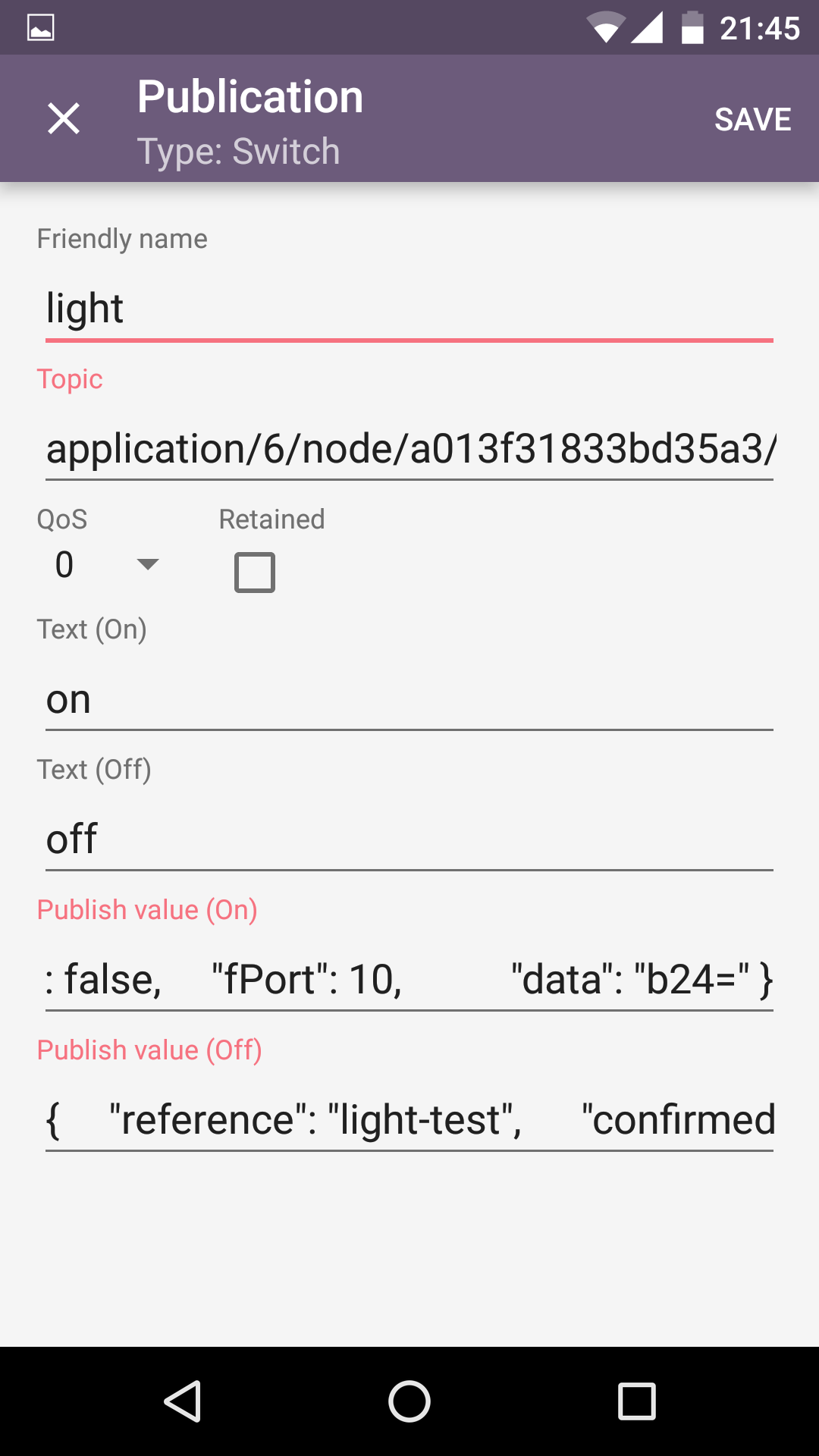 "confirmed": false, // whether the payload must be sent as confirmed data down or not