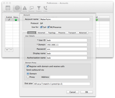 La configuration d'un softphone est très simple: il suffit de renseigner le nom de l'utilisateur, son mot de passe, et l'adresse du serveur Asterisk, généralement appelé domaine. La figure 4 présente une capture d'écran de la configuration du logiciel X-Lite sous Mac OS X.
