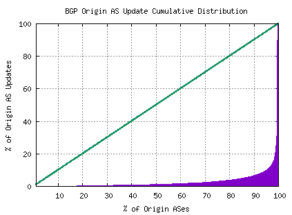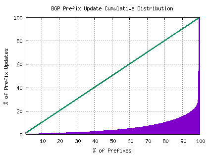 Les figures 4 et 5 permettent de révéler des propriétés importantes de la dynamique du routage BGP. En particulier, nous notons sur la figure 4 que 5% des systèmes autonomes sont à l'origine de 80% des mises à jour BGP. Sur la figure 5, nous notons que 90% des mises à jour de préfixes concernent uniquement 15% des préfixes annoncés. Si le routage BGP peut paraître instable au vu du nombre de messages de mise à jour, cela concerne dans la réalité un petite partie de la table de routage globale !